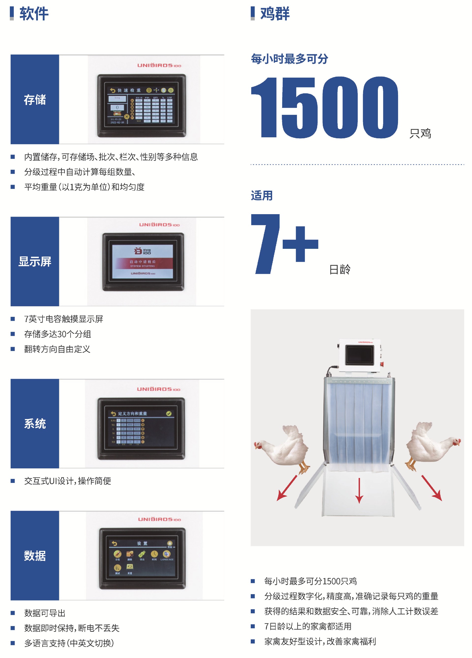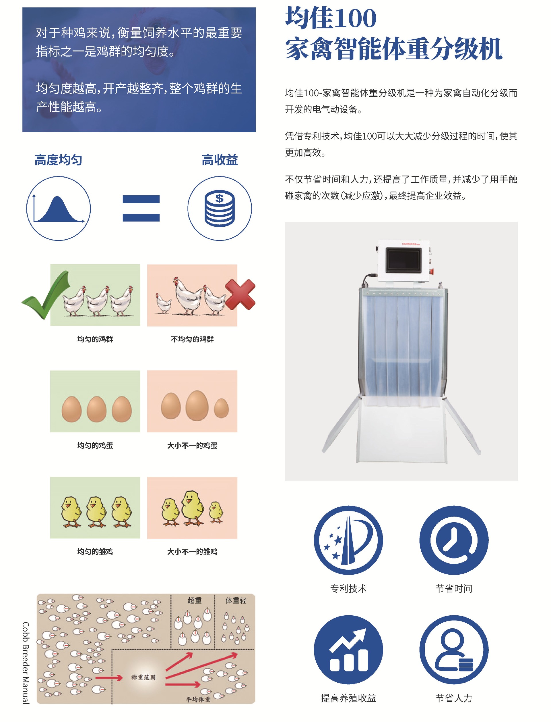 不仅节省时间和人力,还提高了工作质量,并减少了用手触 碰家禽的次数(减少应激),最终提高企业效益。